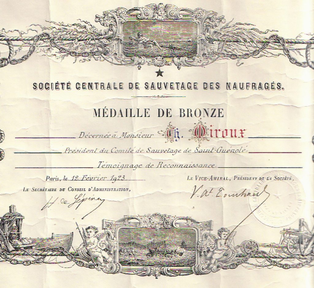 Décernée à Charles Miroux, président du comité de sauvetage de Saint-Guénolé, en témoignage de reconnaissance.
