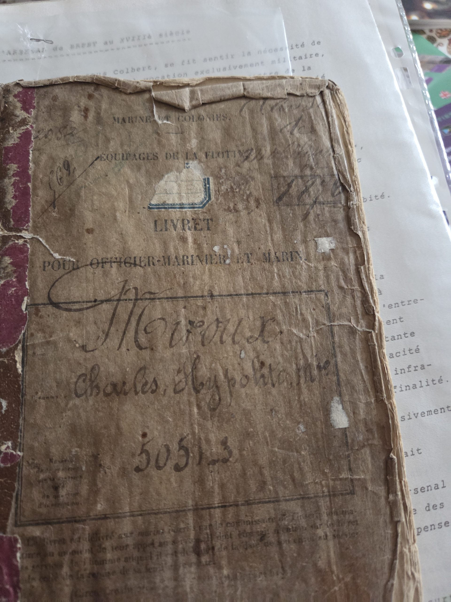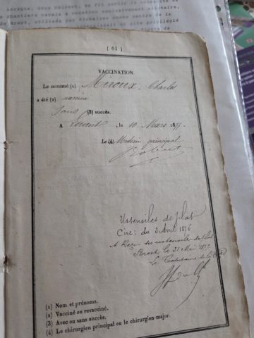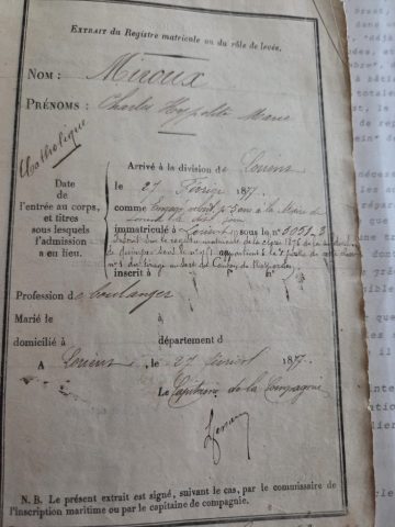 Extrait du livret maritime de Charles Miroux, indiquant son numéro matricule et sa carrière de marin.