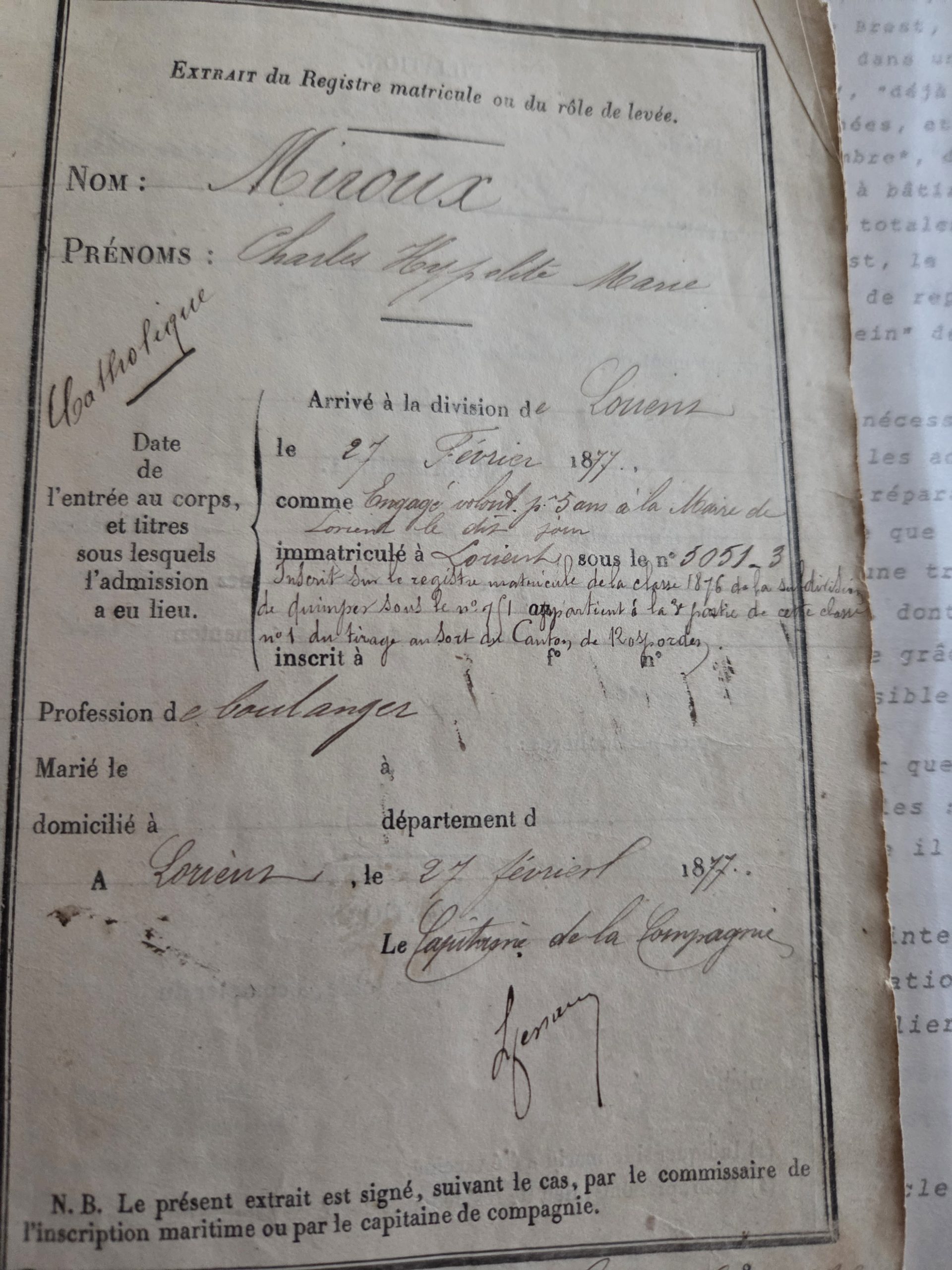 Extrait du registre matricule de Charles Miroux (classe 1876), mentionnant son engagement dans la marine en 1877.