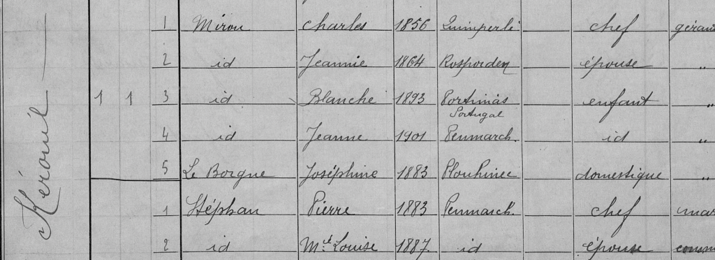 Recensement de 1911. Les deux ainés ne sont plus à la maison, et on note la présence d’une domestique logée au domicile.