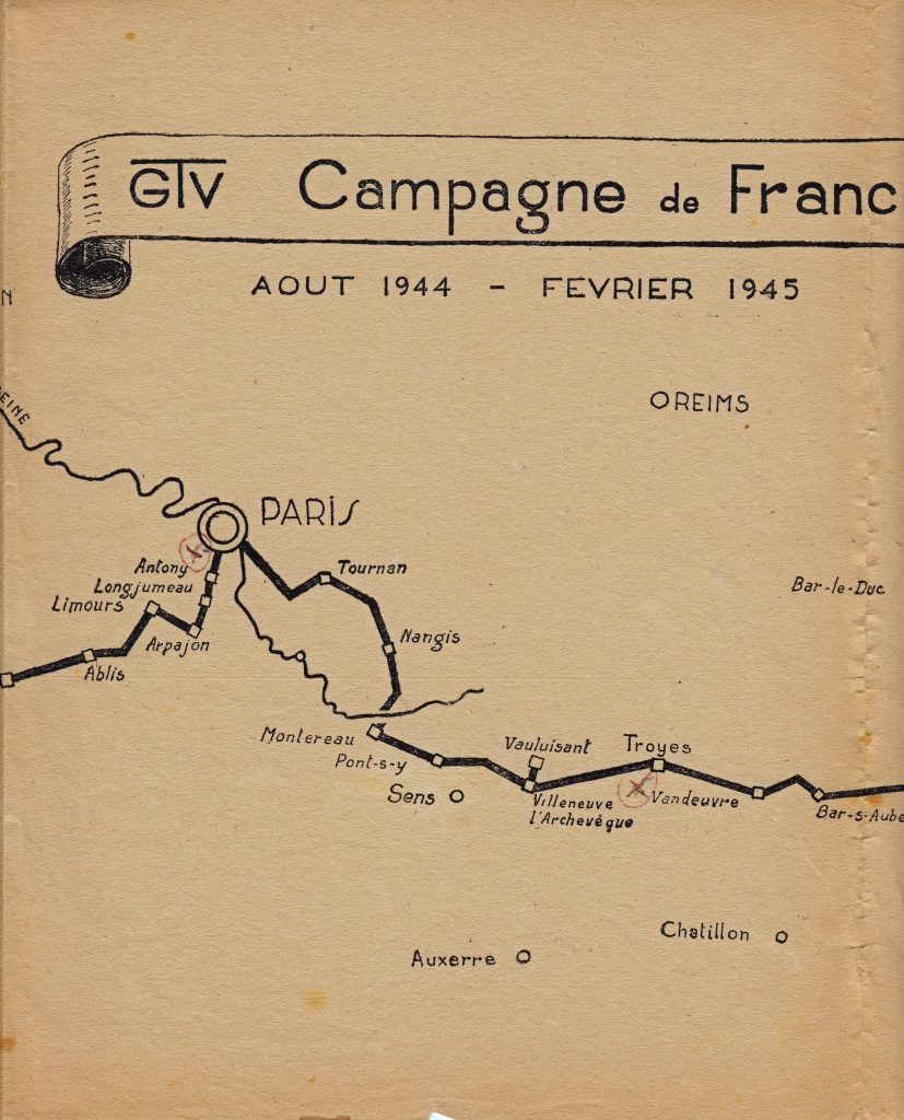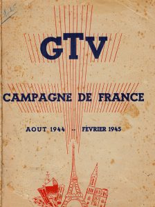 Sur cette carte de la campagne de France, Georges a noté par des croix ses lieux de cantonnement. En cliquant sur chaque carte on peut l’agrandir. Si on clique sur l’image au-dessous, on ouvre le document qui est une sorte de journal de marche de son régiment entre aout 44 et février 45. Tous les combats y sont détaillés. GTV signifie Groupement Tactique Waradiot, du nom du premier officier commandant ce groupe.