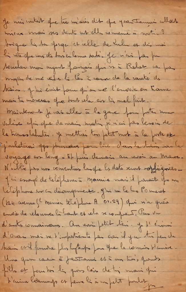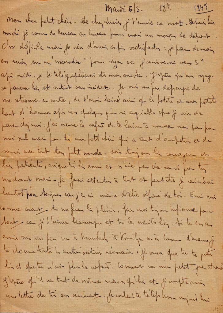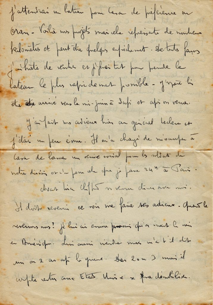Le 11 mars, il est encore en route pour rentrer de permission. Il évoque ici les difficultés pour se déplacer entre le Maroc et la France encore en guerre, et sa détestation de la ville d’Oran.