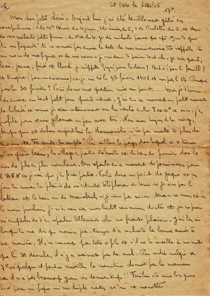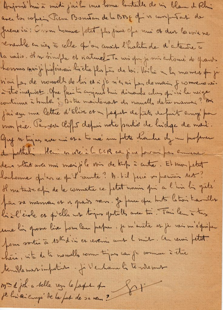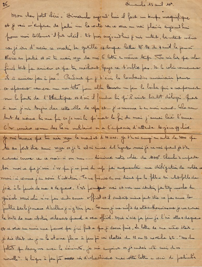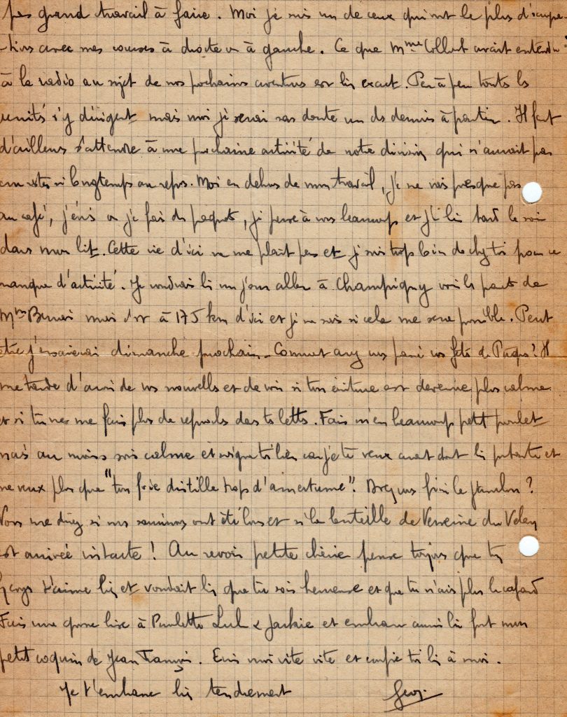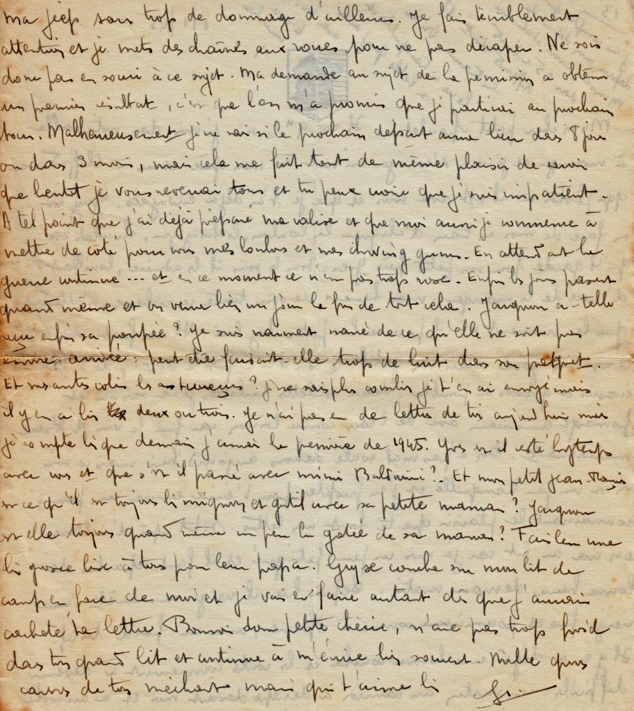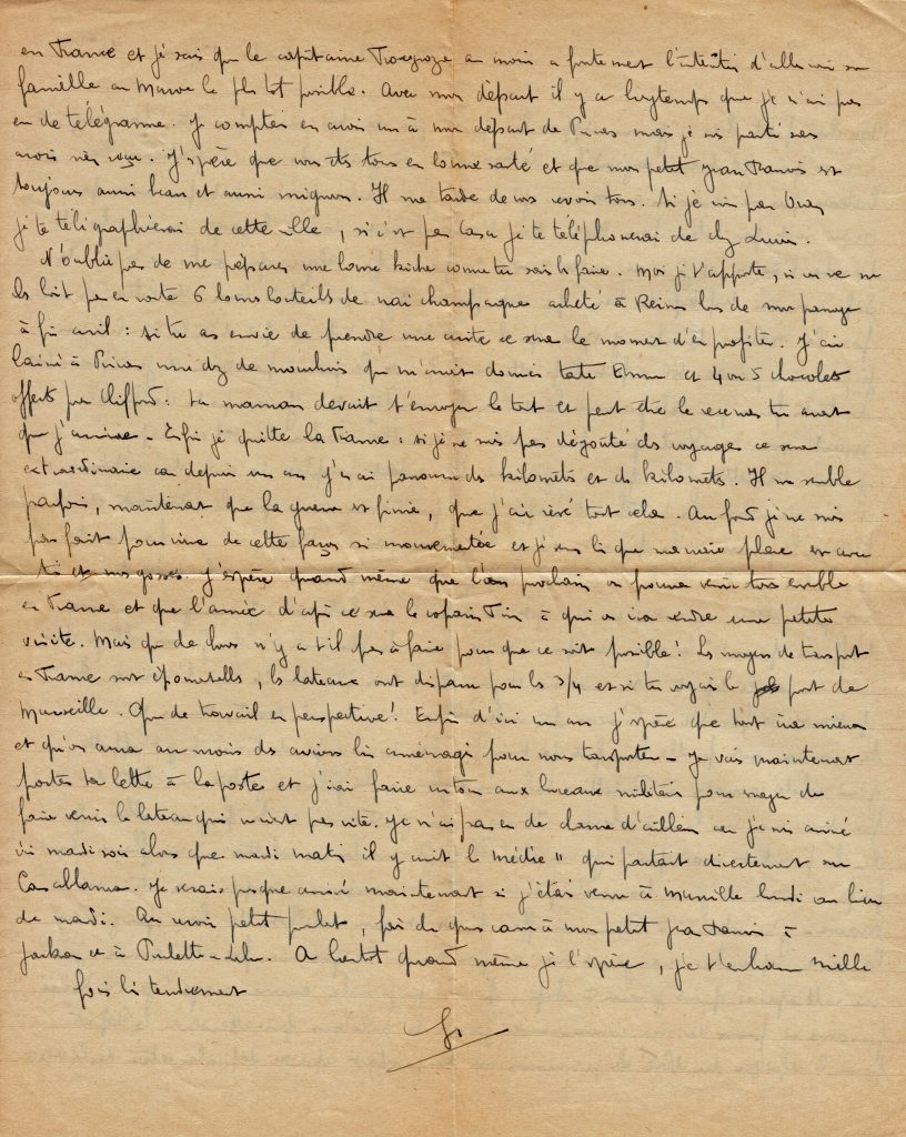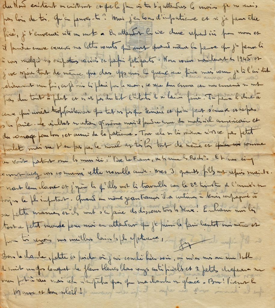 C’est la fin de la correspondance que Georges a tenu avec son épouse Yvonne, restée au Maroc avec trois filles, puis un garçon qu’il ne rencontrera que lors de sa permission de février 1945.