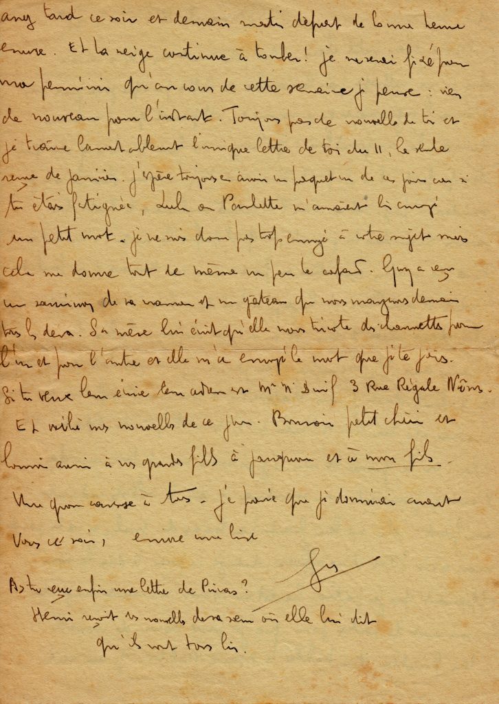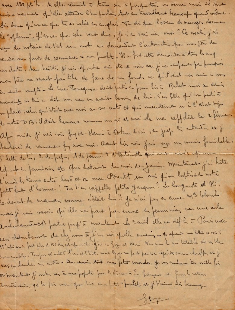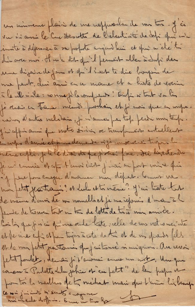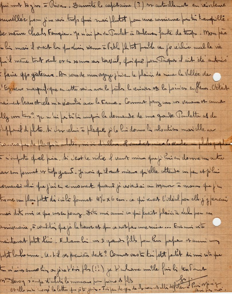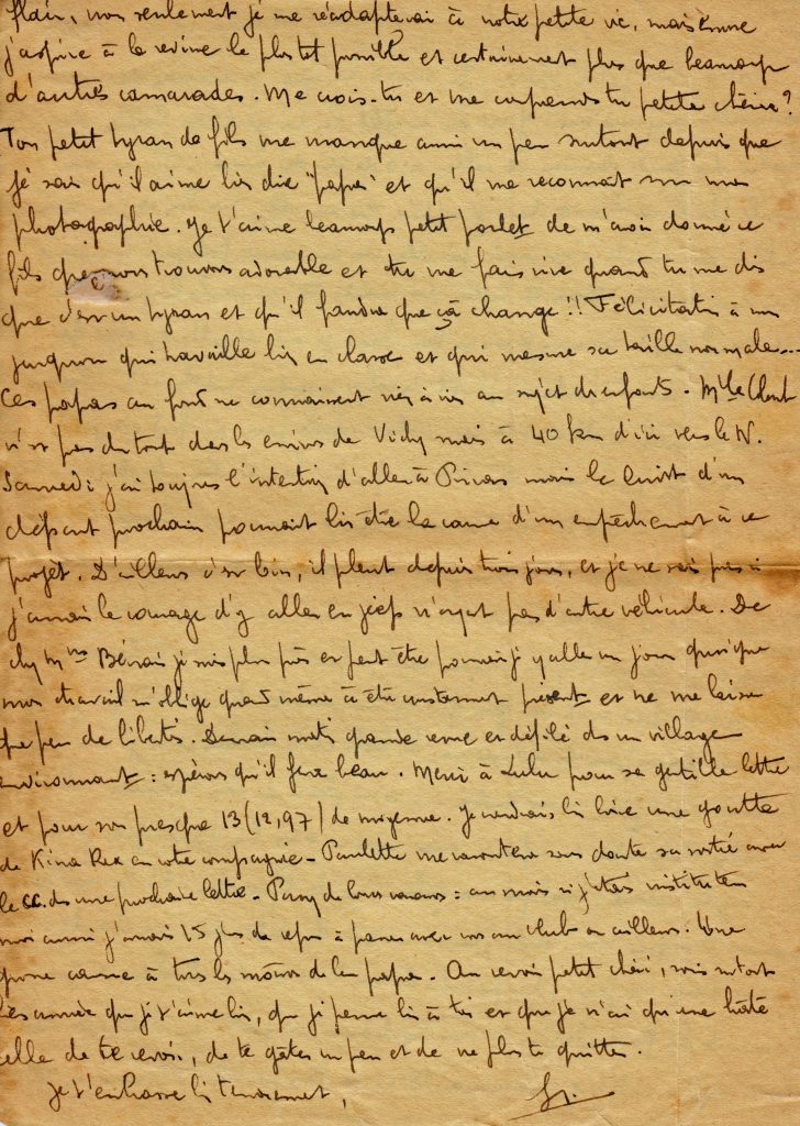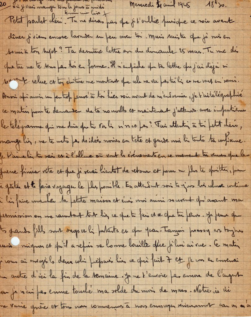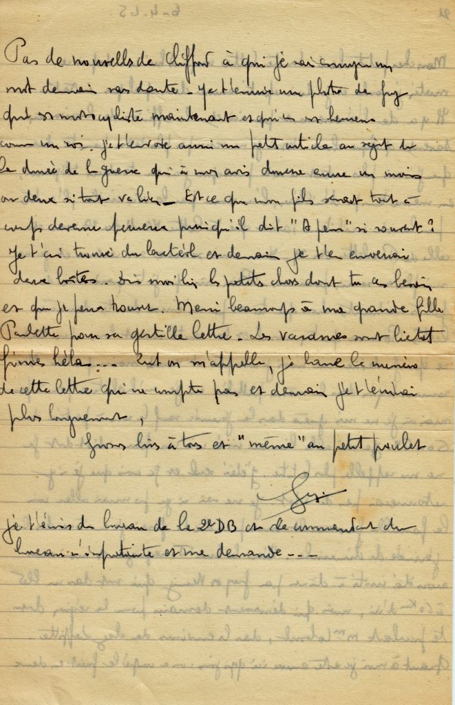 C’est la fin de la correspondance que Georges a tenu avec son épouse Yvonne, restée au Maroc avec trois filles, puis un garçon qu’il ne rencontrera que lors de sa permission de février 1945.