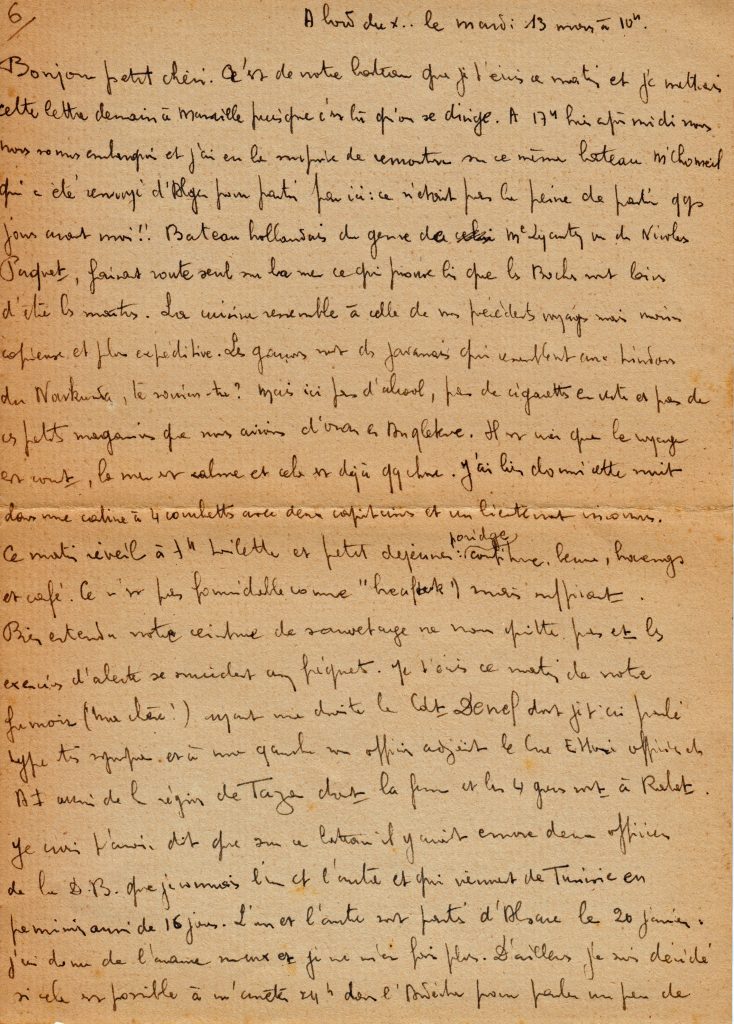 Le 12 mars, il est sur un bateau néerlandais, en route pour Marseille. Il raconte sur quatre feuillets la vie à bord.