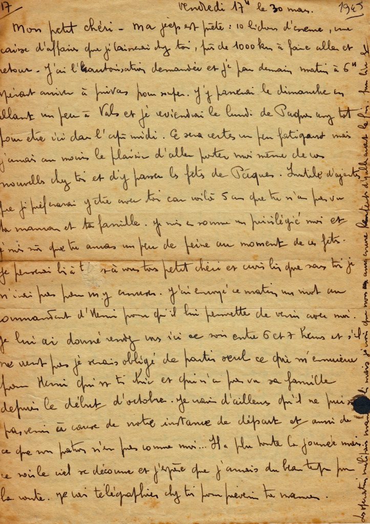 Le 30 mars, son unité étant toujours au repos à Chateauroux, il annonce une virée à Vals et Privas pendant le week-end de Pâques avec sa Jeep et son chauffeur qui restera dans sa famille à Clermont- Ferrand (cf. photos)