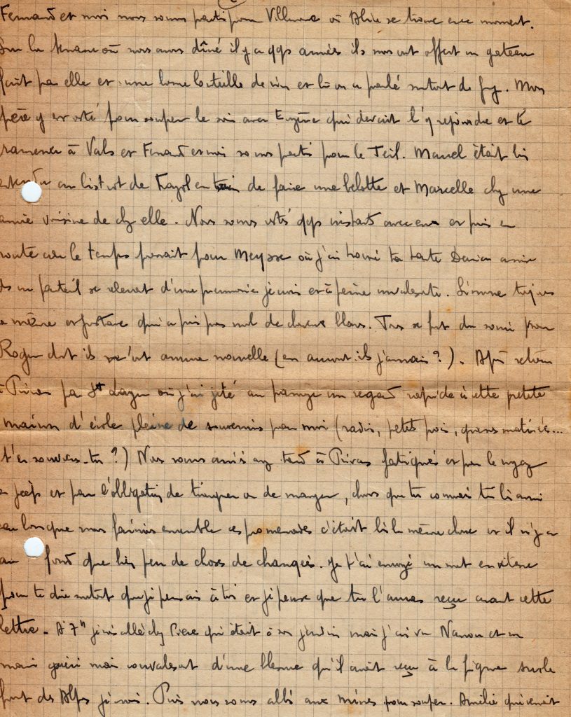 Le 2 avril, sur quatre feuillets, il fait un compte rendu de son voyage à travers la France, et des visites qu’il a effectuées à Vals et à Privas. Il parle du cousin d’Yvonne, déporté en 1944. La photo a été prise à Privas, la fille de Marguerite est assise sur la jeep de Georges.