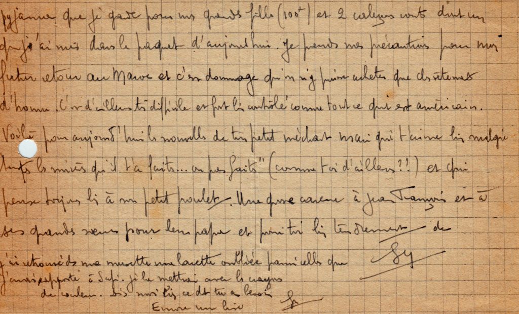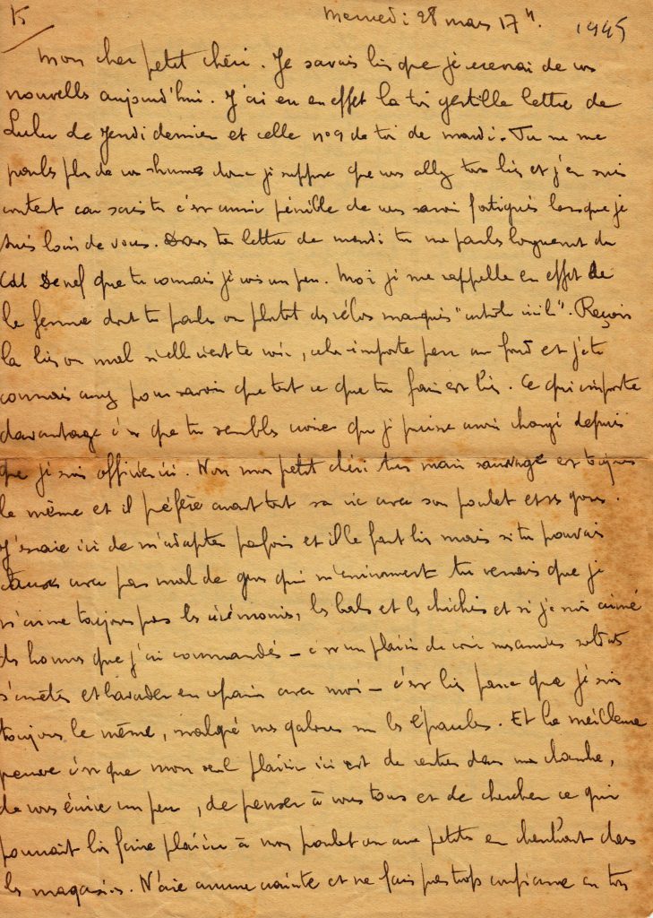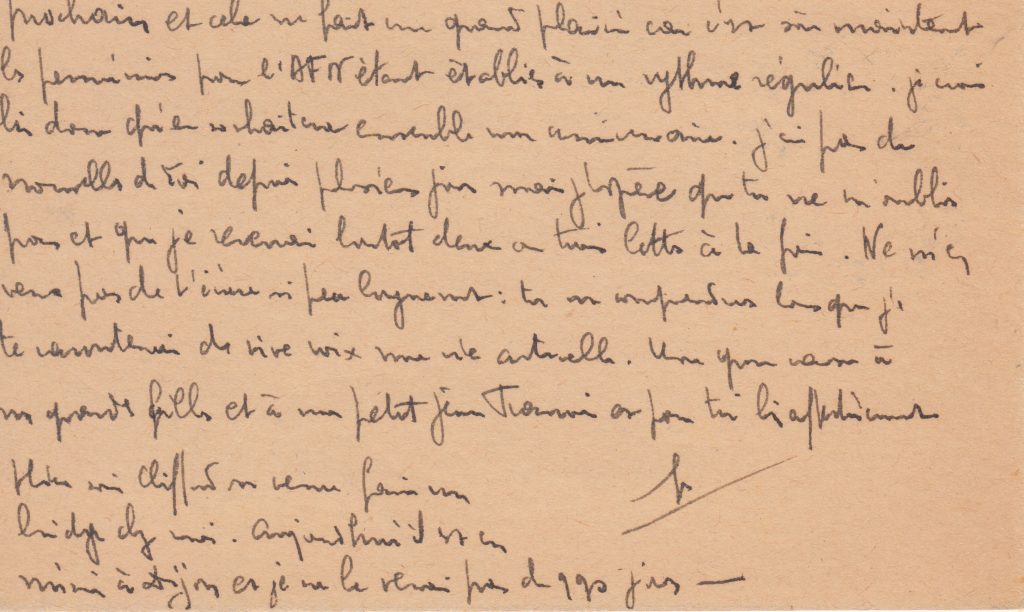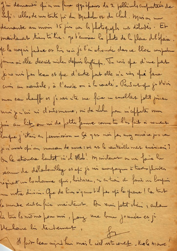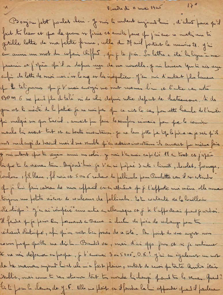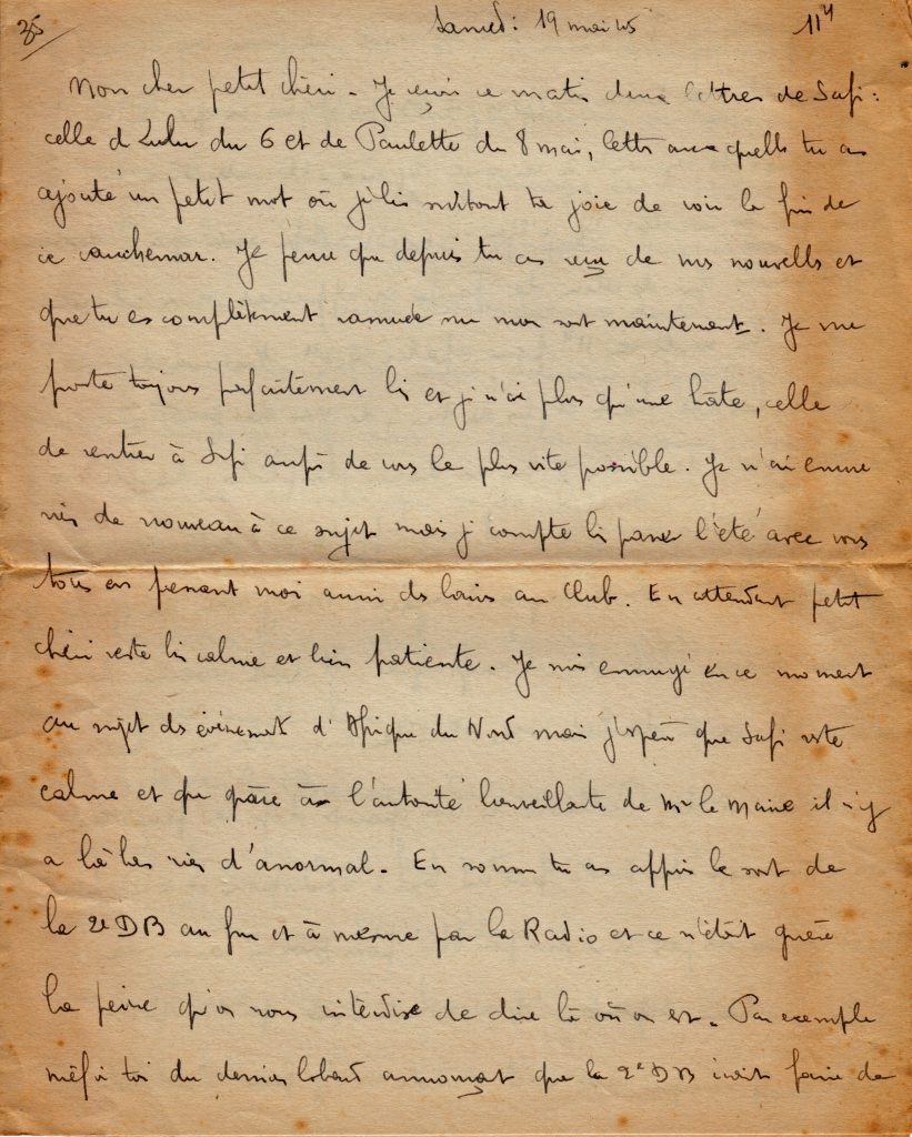 Longue lettre de quatre feuillets le 19 mai, où il s’inquiète des événements en Afrique du Nord et demande à Yvonne de ne pas écouter les bobards concernant la 2e DB.