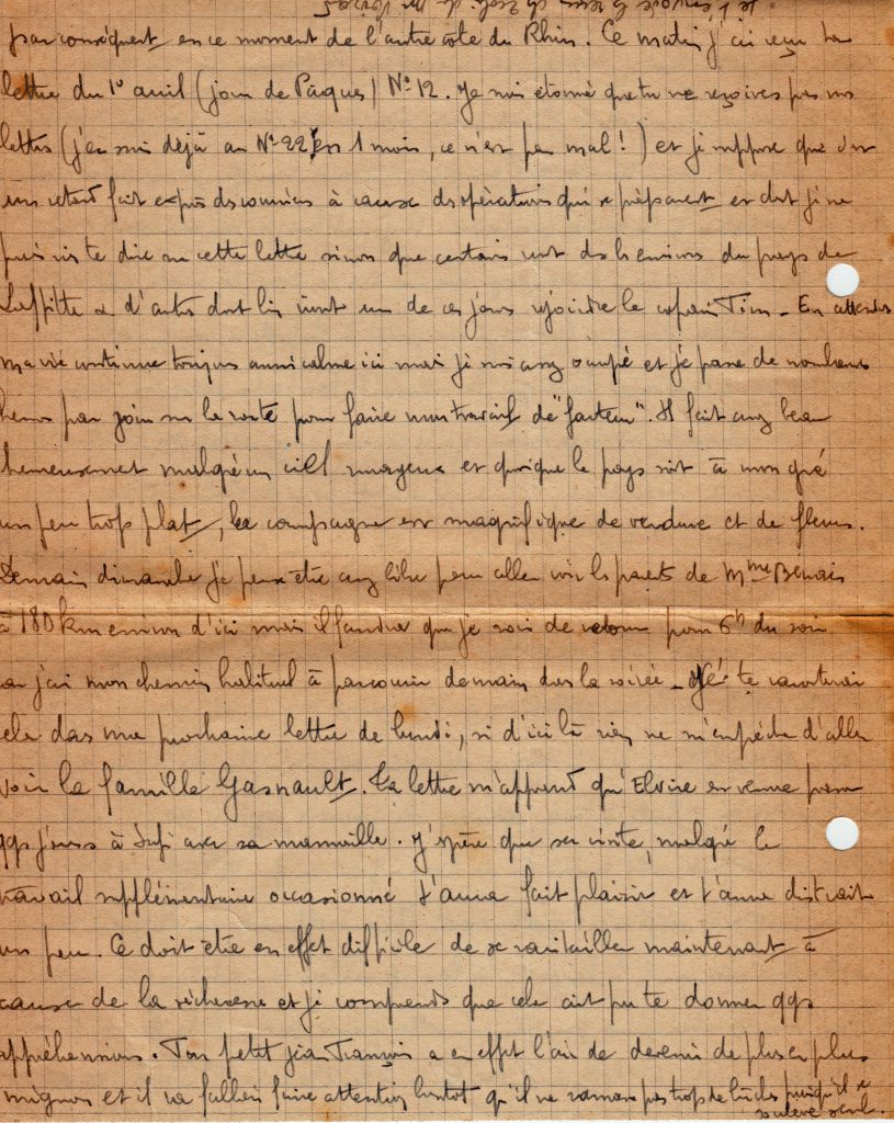 La lettre du 19 avril, où il raconte à demi-mot ce qui se passe. Il part pour le pays de Tim, son ami américain, dont il a dit précédemment qu’il était de l’autre côté du Rhin, en Allemagne, d’où les nouvelles sont bonnes, malgré la résistance allemande.
