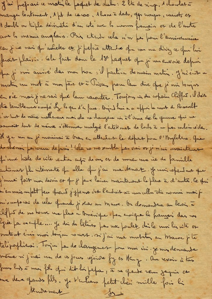 Curieux, ce courrier du 13 avril, jour où il apprend la mort de Roosevelt, mais où on a plus d’information sur la vie au Maroc, les indéfrisables , et même un projet, qui n’a pas été mené à bien, d’installation aux USA.