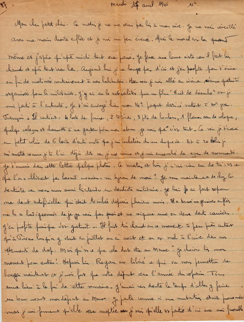 Le 17 avril, il est question d’un départ pour le front en Allemagne mais commence aussi ses réflexions sur la fin de la guerre et son retour au Maroc, sa mutation.