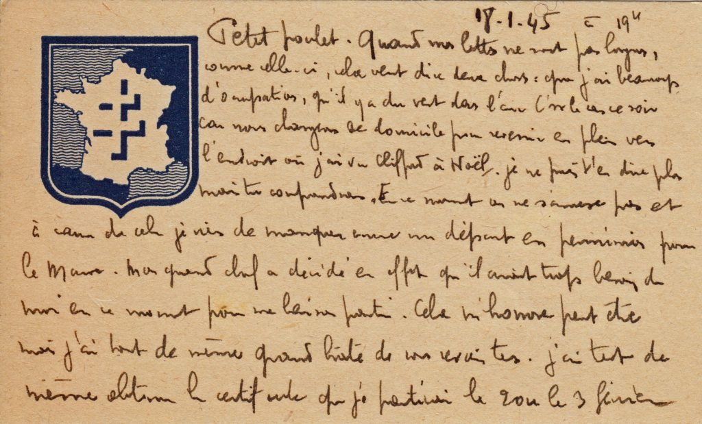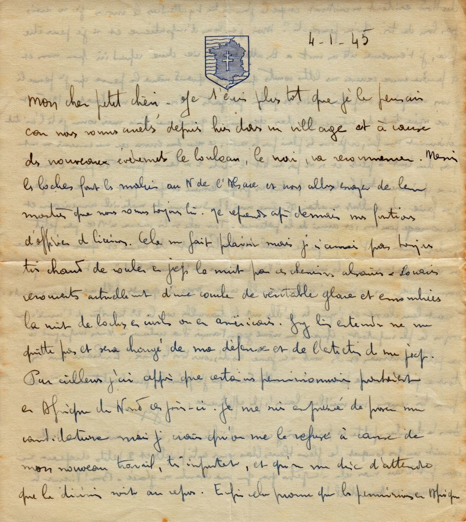 Le 4 janvier, Georges parle de sa nouvelle fonction et des difficultés qu’elle représente, et ses réflexions sur la guerre qui est loin d’être finie sont à relier avec la contre-offensive allemande dans les Ardennes de fin décembre 44 dont il ne peut bien sûr pas parler. On peut remarquer le nouveau papier à lettre qu’il utilise.