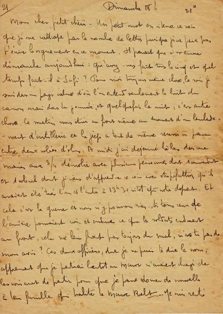 Le 24 janvier, il n’en dit pas grand chose, à cause de la censure, juste « la guerre est dure », et dit en fin de lettre que la jeep ne vaut pas une conduite intérieure.