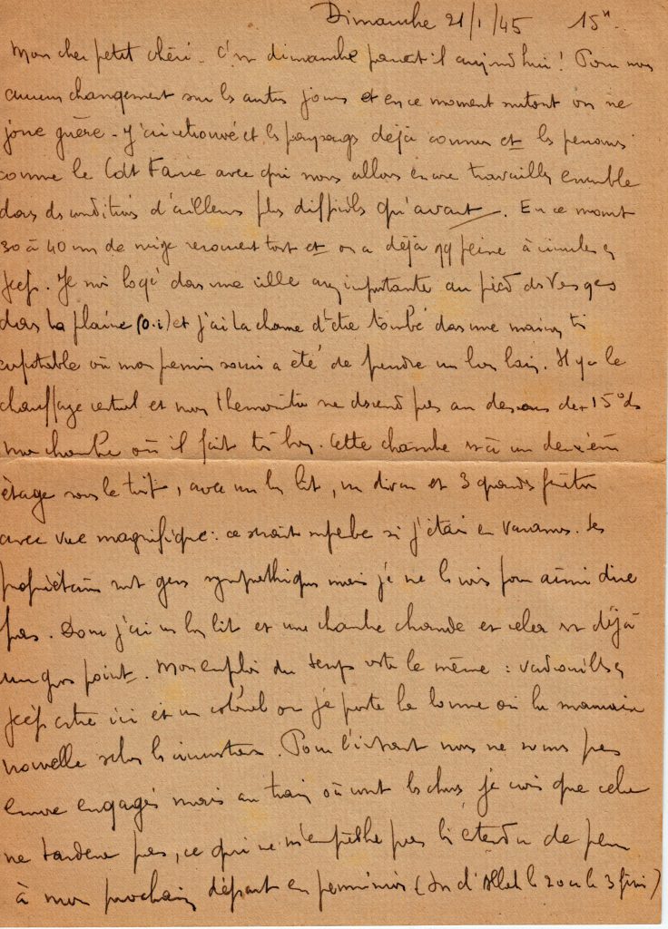 Le 7 janvier 1945, il vient d’être nommé officier de liaison auprès du commandement. Il est en Alsace et raconte ses condition de vie. Pour info, Mme Ruelle vient de Lorraine.