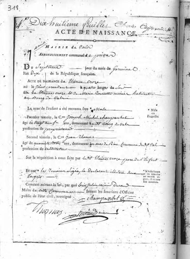 À l’origine, il y a la naissance d’Etienne Croze à Vals-Les-Bains, le septième jour du mois de Germinal, an Dix, soit le 28 mars 1802. C’est le fils d’Etienne Croze, illettré, et de Marie Tourette, demeurant tous deux à Vals. Je n’ai pas d’autre informations sur les parents d’Étienne, juste leur nom sur l’acte de naissance.